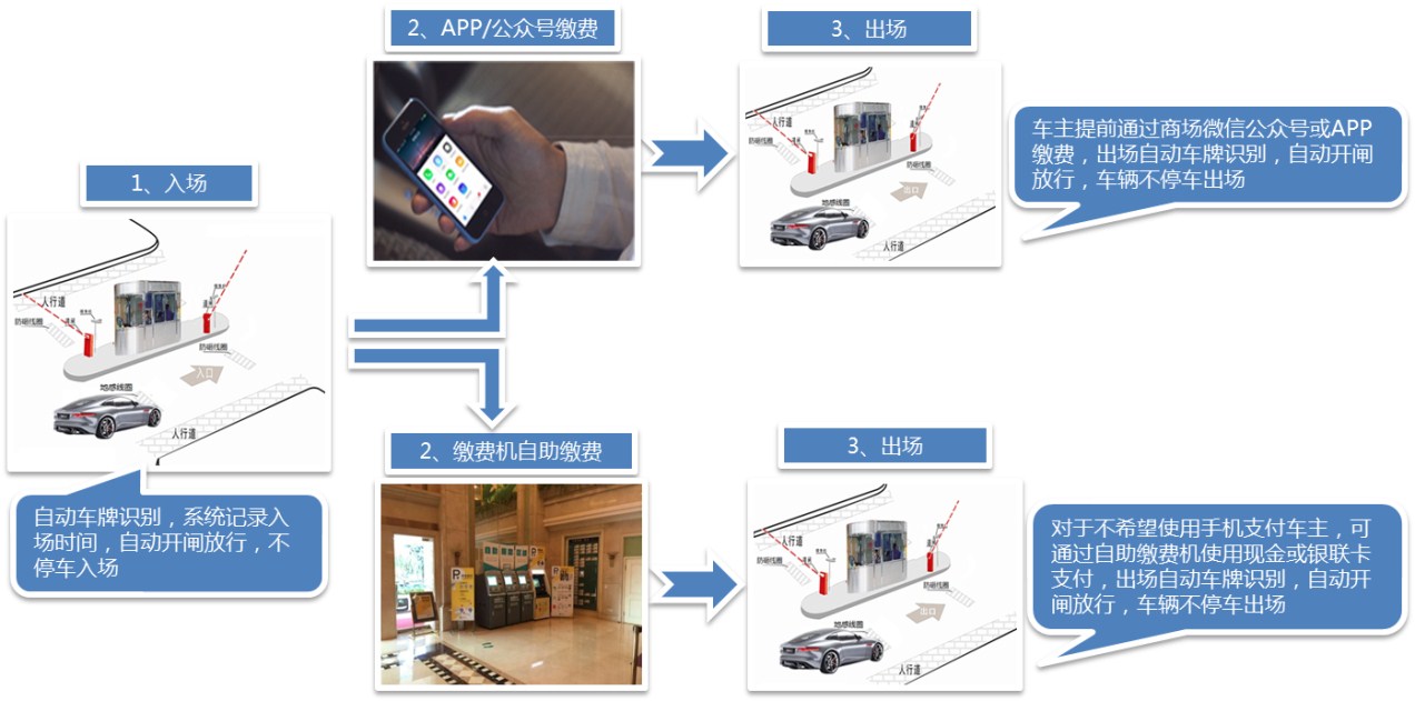 臨時車輛車牌識別不停車進(jìn)場,手機(jī)/自助繳費機(jī)自助繳費后不停車出場,給臨時車輛帶來極佳的停車體驗。