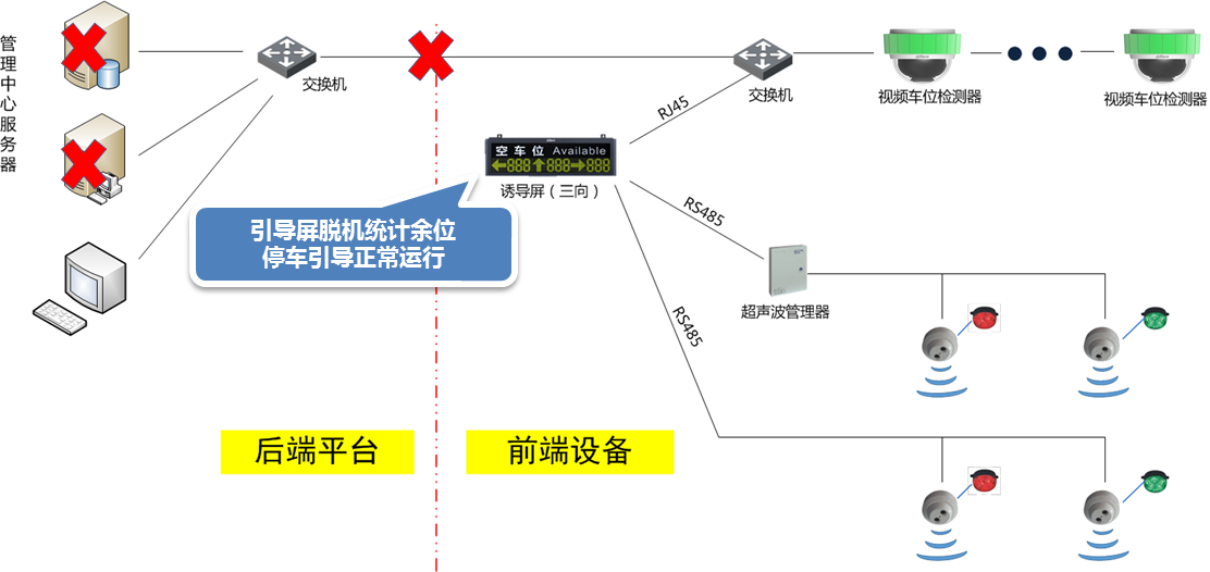 管理服務(wù)器故障或網(wǎng)絡(luò)異常時,引導(dǎo)屏脫機(jī)統(tǒng)計余位,停車引導(dǎo)系統(tǒng)仍可正常運行。