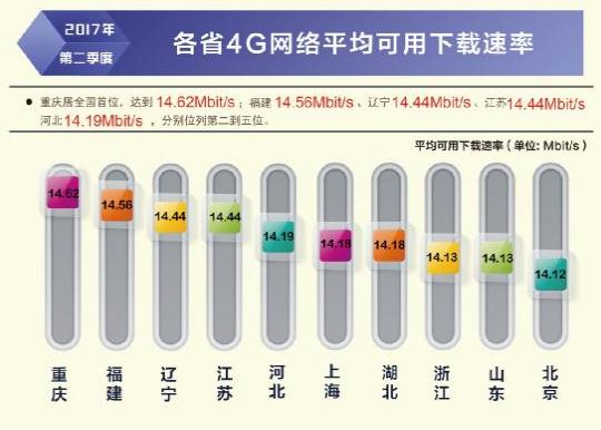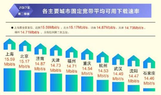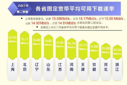 根據本次報告,除西藏自治區(qū)外,全國其他所有省級行政區(qū)域固定寬帶平均下載速率均超過 12Mbit/s,上海、北京、遼寧率先超過或達到了 15Mbit/s,位列全國前三,山東、江蘇緊隨其后。在直轄市和省會城市固定寬帶下載速率排行榜上,上海、北京、濟南、天津、福州位居前五位。從移動寬帶網速狀況看,重慶、福建、遼寧、江蘇、河北的 4G 網絡用戶下載速率排在全國省級行政區(qū)前五位;不同電信運營企業(yè)中,中國聯(lián)通的 3G 網絡用戶下載速率和 4G 網絡用戶下載速率均最高,分別達到 5.20 Mbit/s 和 15.05 Mbit/s。